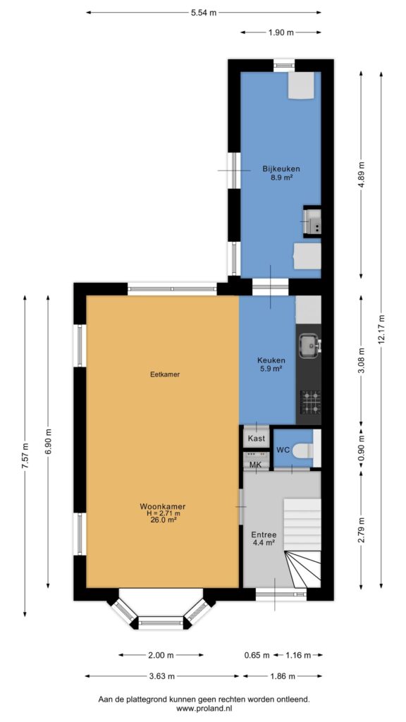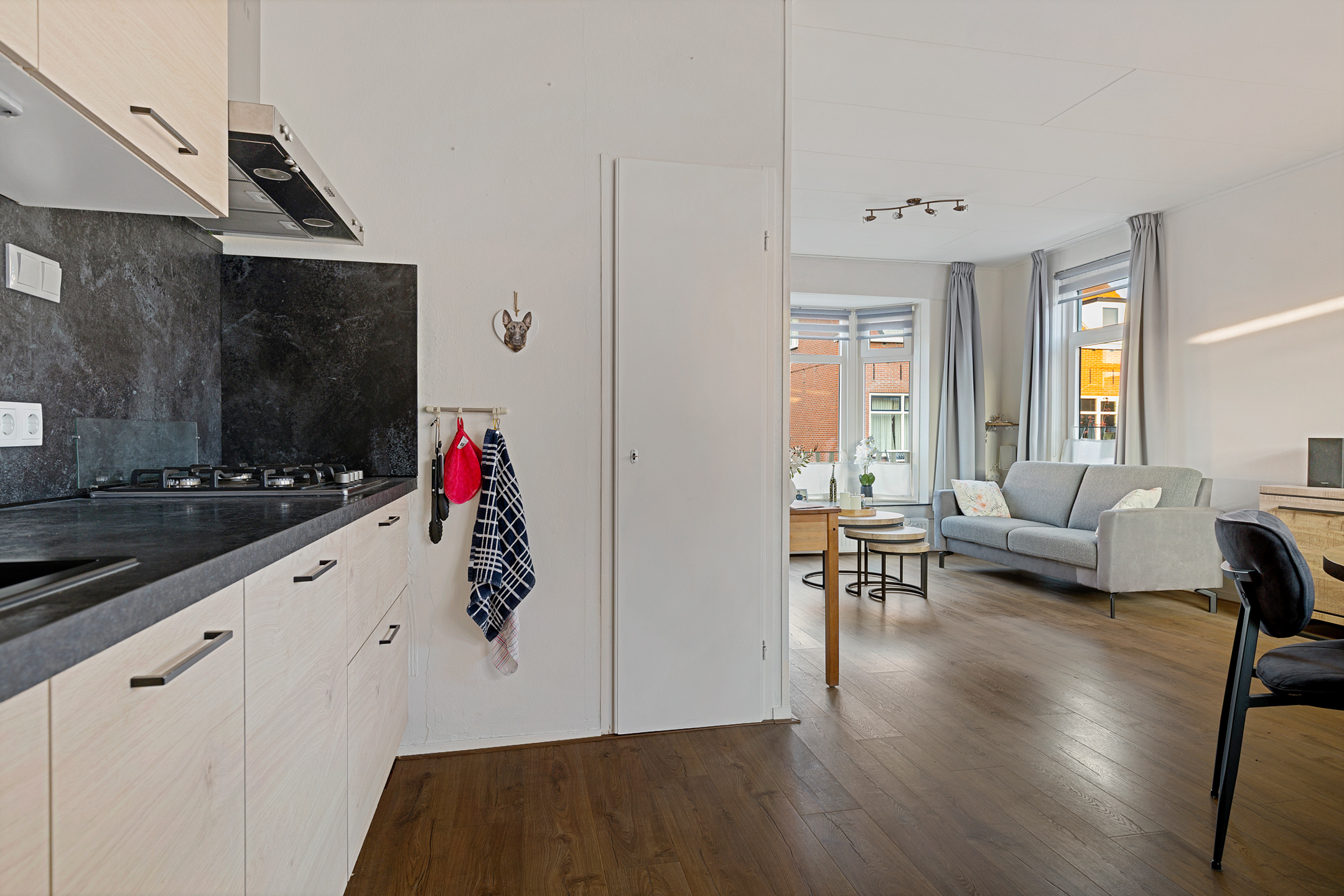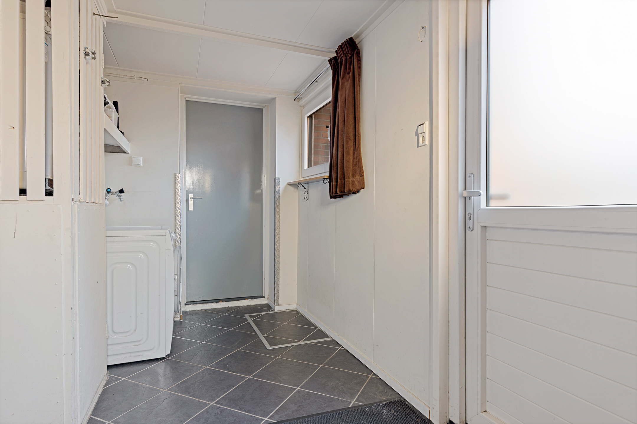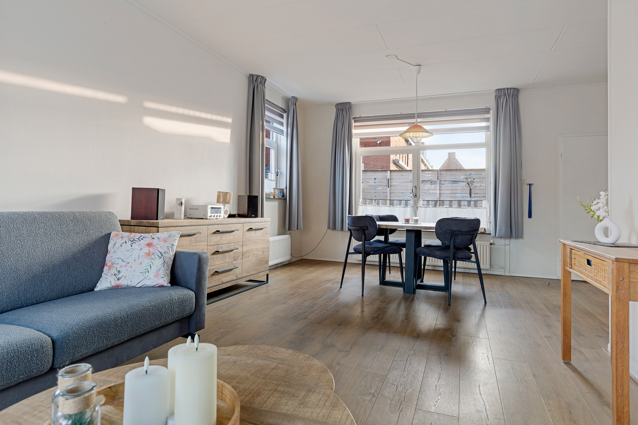 Entree/hal met meterkast, toilet en opgang naar de verdieping, woonkamer (ca. 26 m²), half open keuken (ca. 6 m²; met kastruimte en keukenblok uit 2022 voorzien van koelkast, combi-magnetron, 4-pits gaskookplaat en afzuigkap), bijkeuken met witgoedaansluitingen, cv-opstelling en achterdeur.