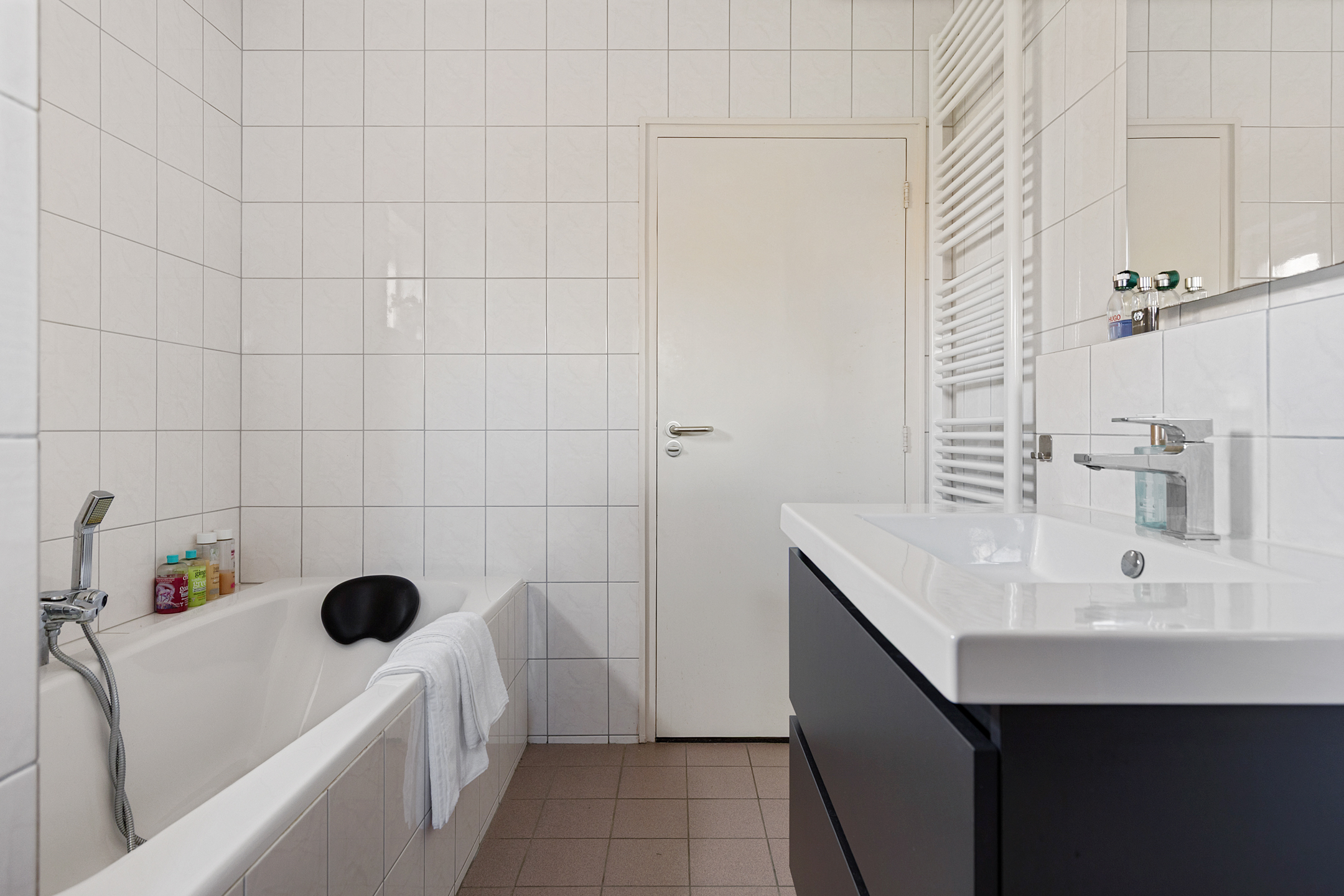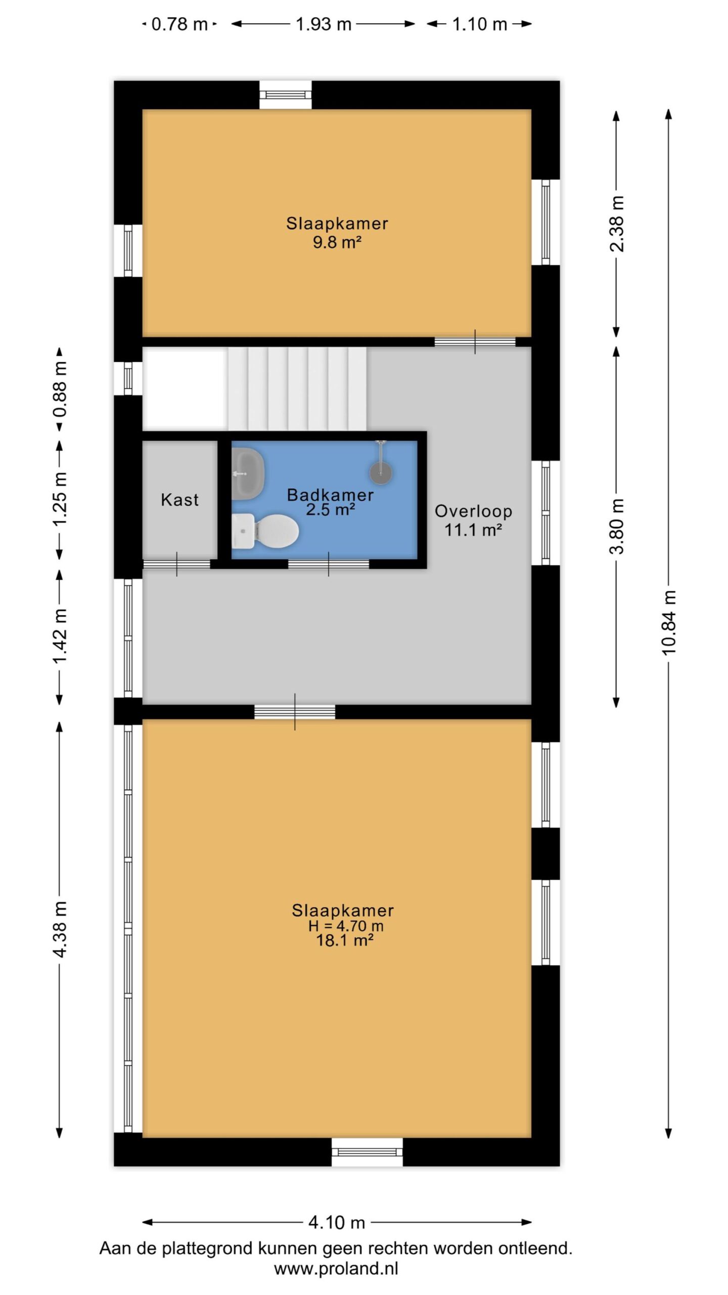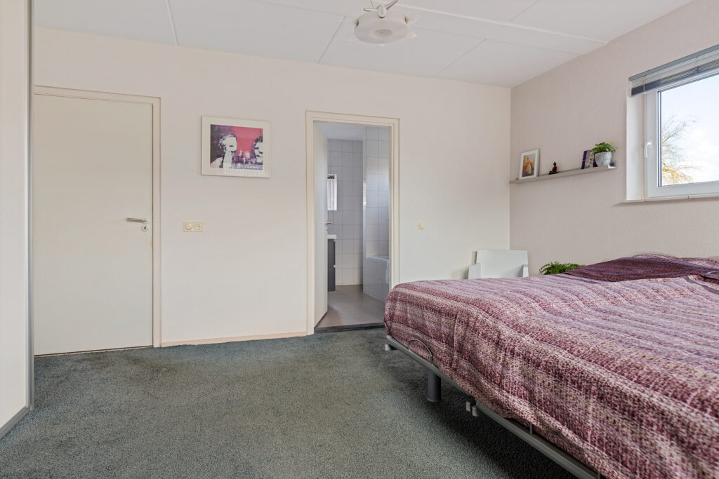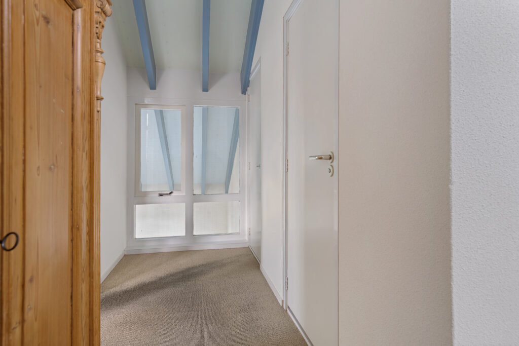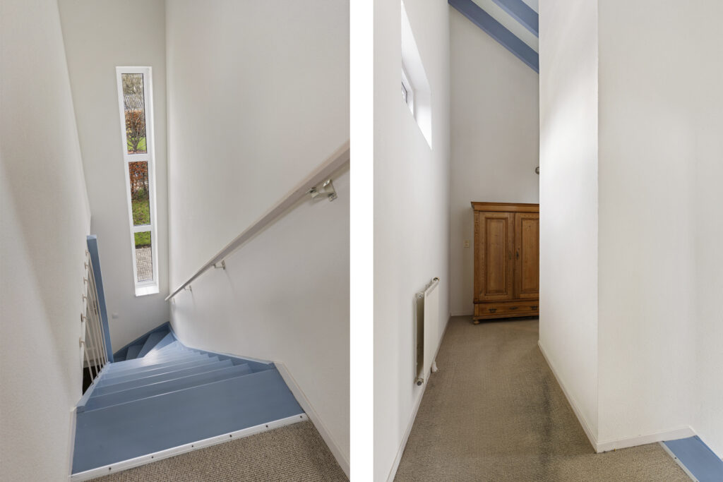Middels vaste trap te bereiken overloop met aangrenzend slaapkamer (ca. 10 m²), badkamer (ca. 2,5 m²; met douche, wastafel en toilet), kastruimte en slaapkamer (ca. 18 m²).