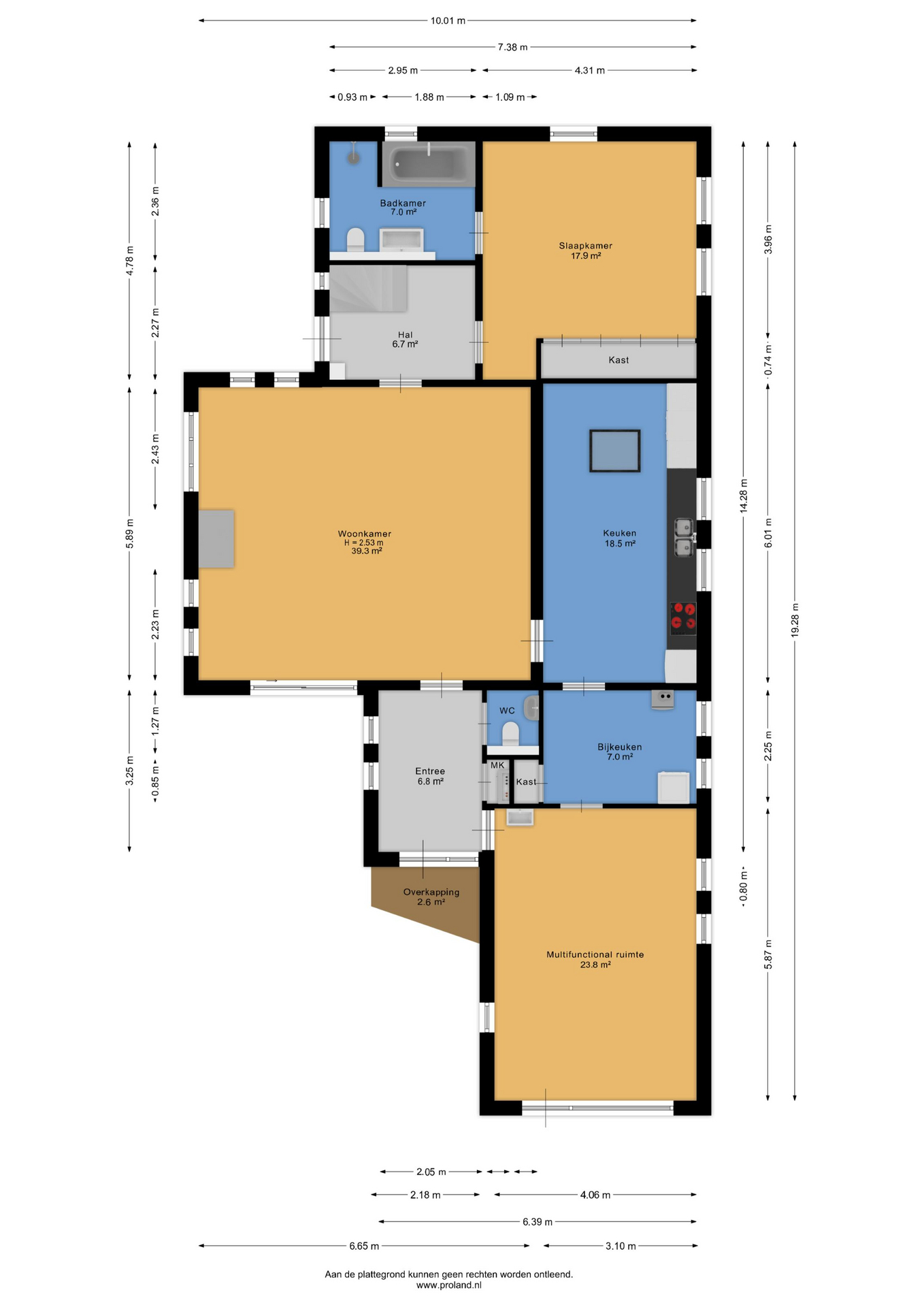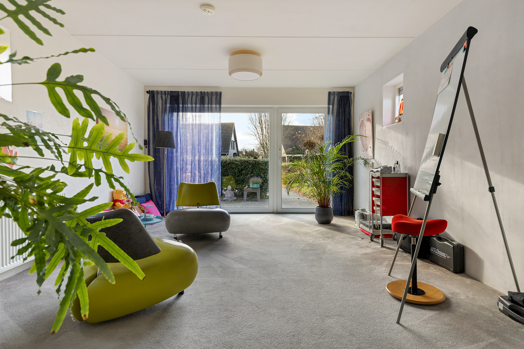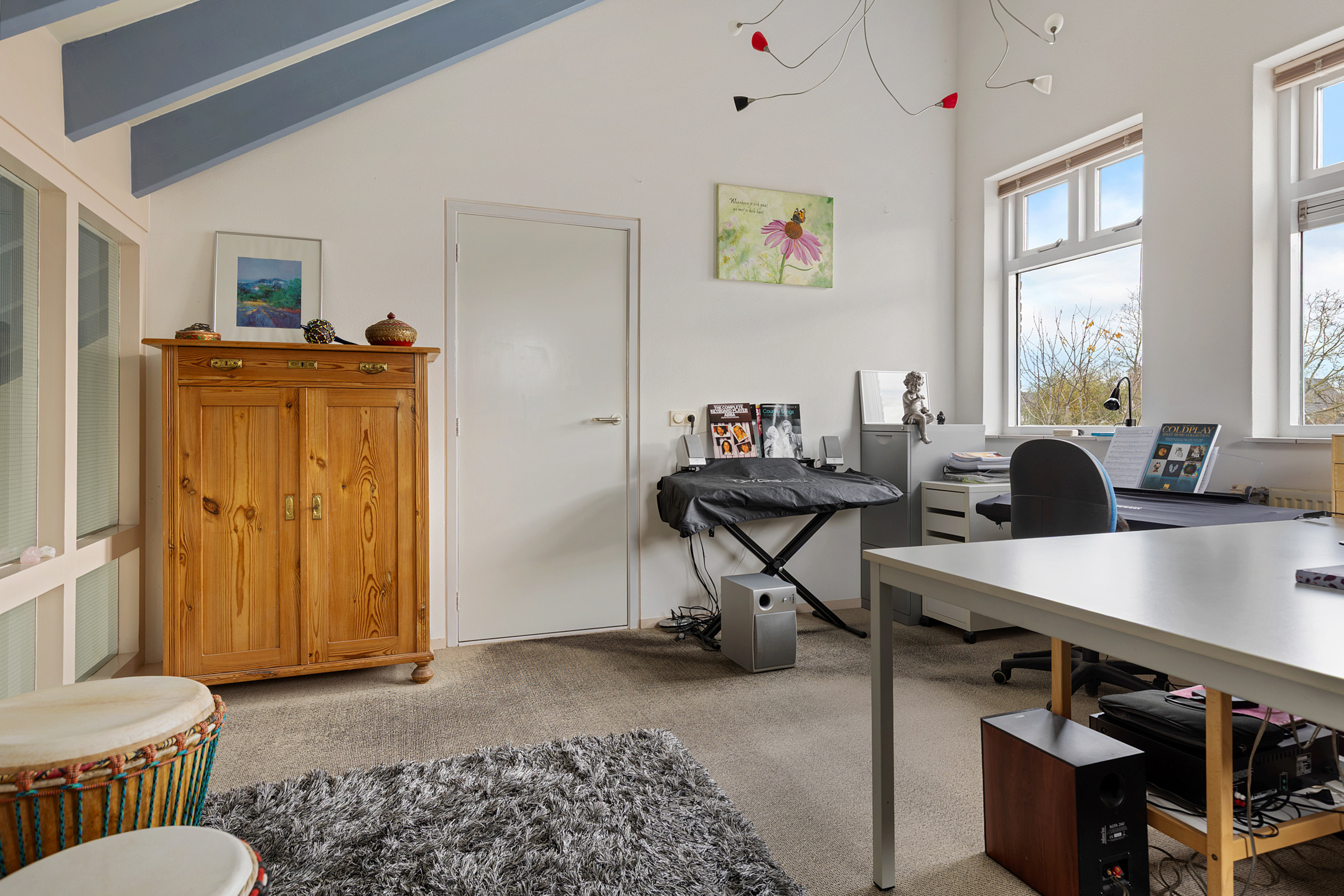 Entree/hal met meterkast, toilet en toegang naar de multifunctionele (ca. 24 m²), woonkamer (ca. 39,5 m²; met haard en schuifpui), dichte woonkeuken (ca. 18,5 m²; met keukenblok uit 2023 voorzien van koel-/vriescombinatie, inductiekookplaat, afzuigkap en oven), aangrenzende bijkeuken (ca. 7 m²; met witgoedaansluitingen en cv-opstelling). Vanuit de woonkamer te bereiken achterhal met opgang naar de verdieping en toegangsdeur naar de tuin, slaapkamer (ca. 18 m²; met vaste kastruimte) en badkamer en suite (ca. 7 m²; met douche, ligbad, wastafelmeubel en toilet).