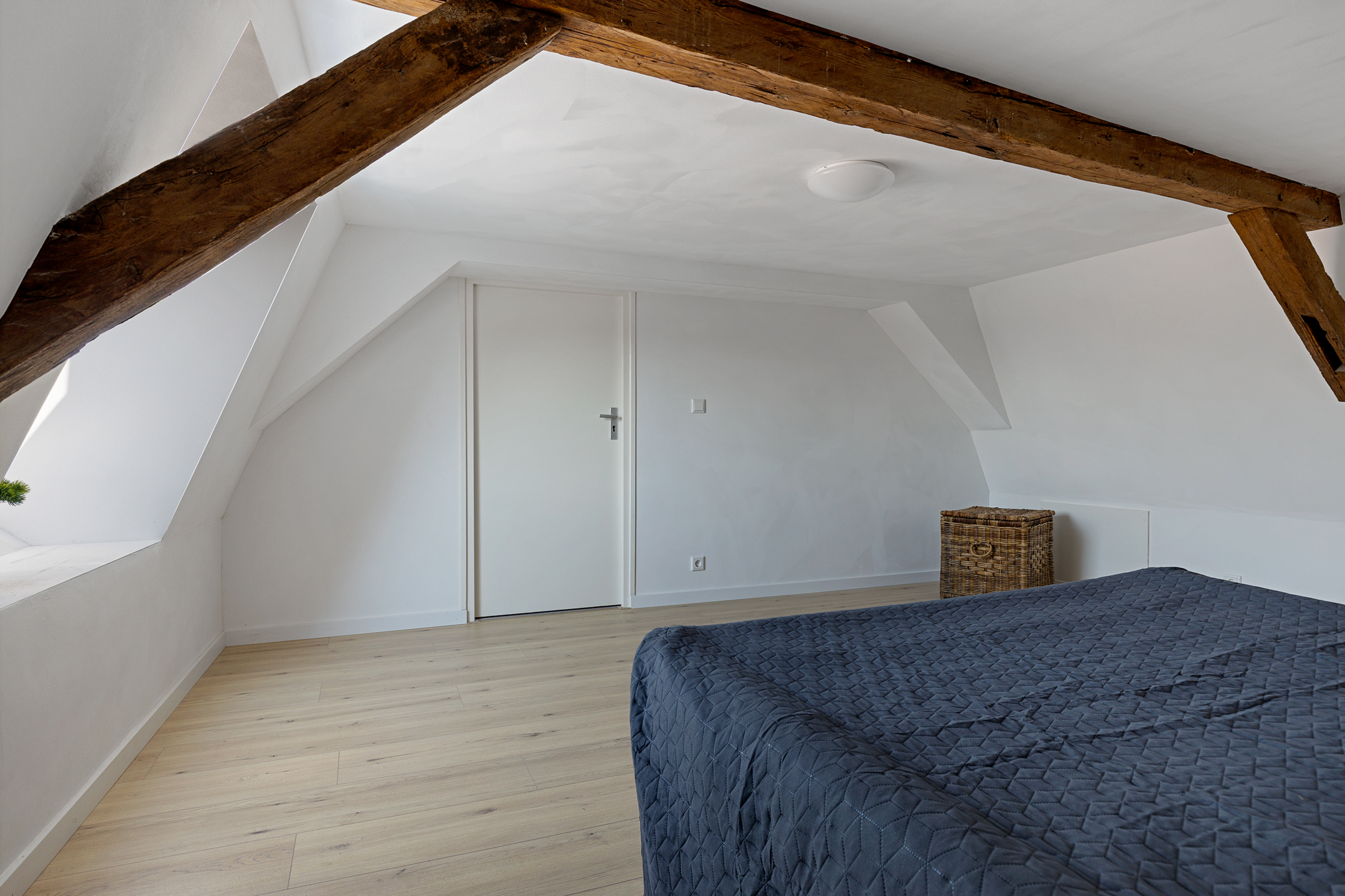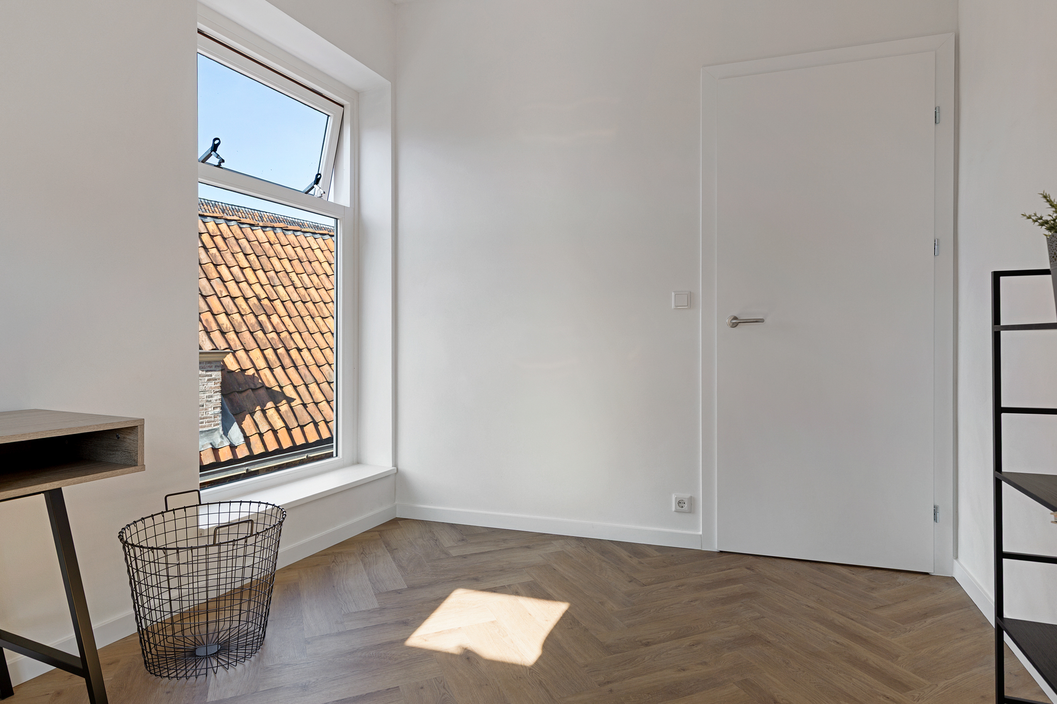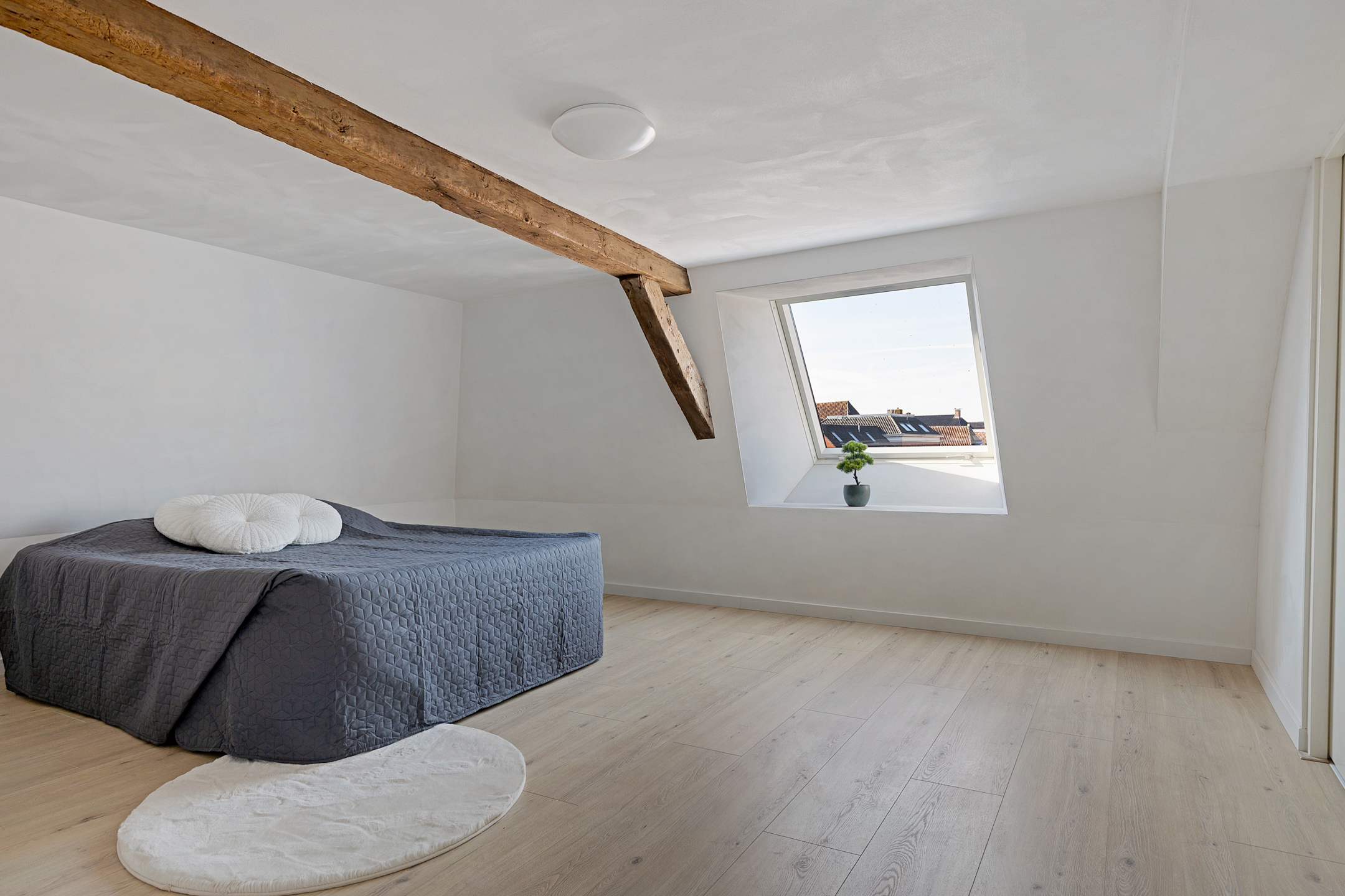 Middels vaste trap te bereiken overloopje met aangrenzend modern toilet, uiterst royale woonkamer met half open keuken (ca. 50 m²; keukenblok voorzien van koelkast, vaatwasser, combi-oven, inductiekookplaat en afzuigkap), trapopgang naar de verdieping en openslaande deuren naar het balkon (ca. 1,5 m²), badkamer (ca. 6 m²; met inloopdouche, wastafelmeubel en witgoedaansluitingen), slaapkamer (ca. 10,5 m²) en slaapkamer (ca. 8,5 m²).