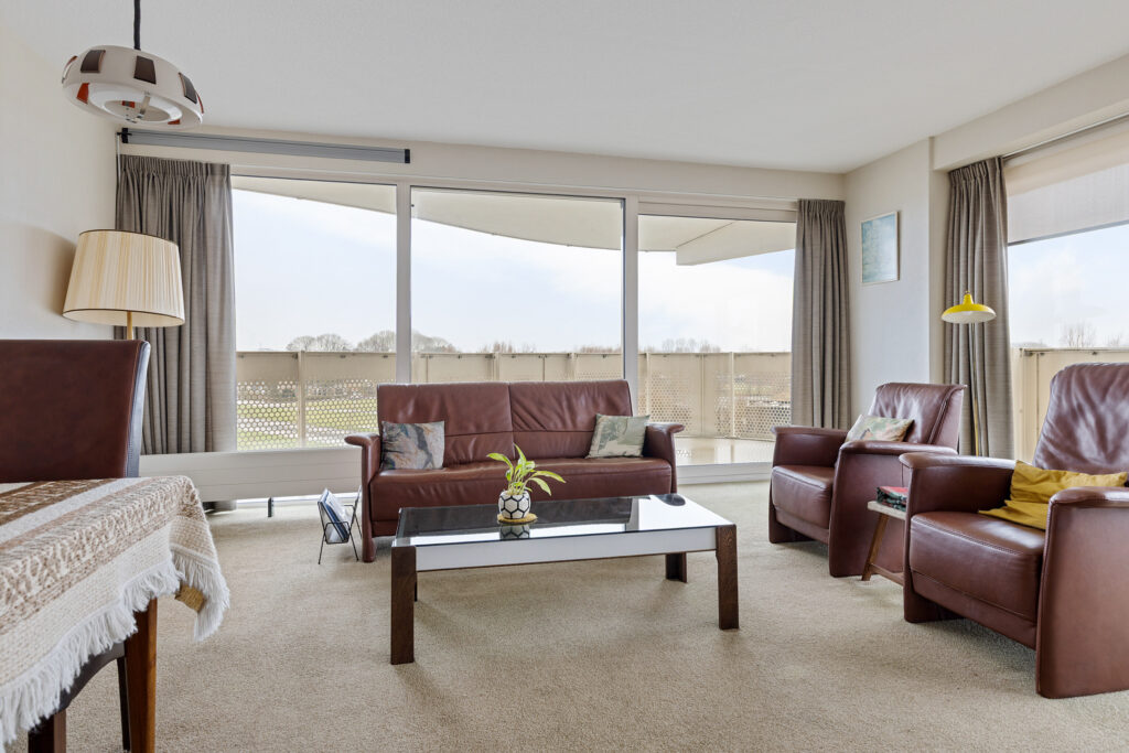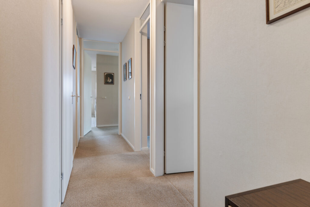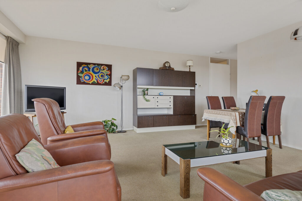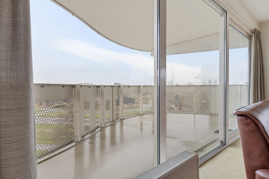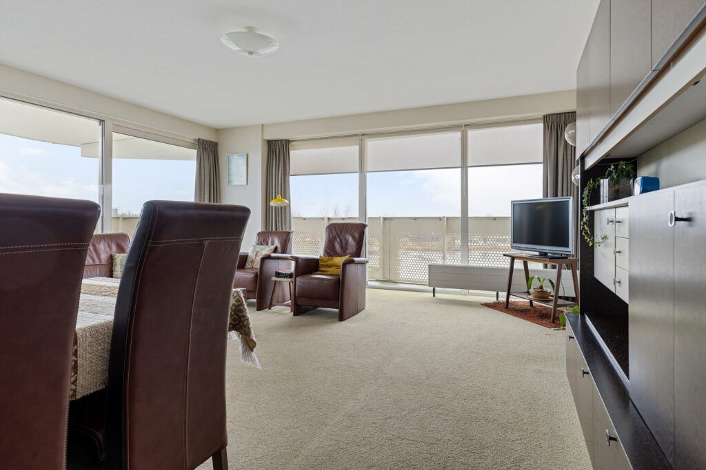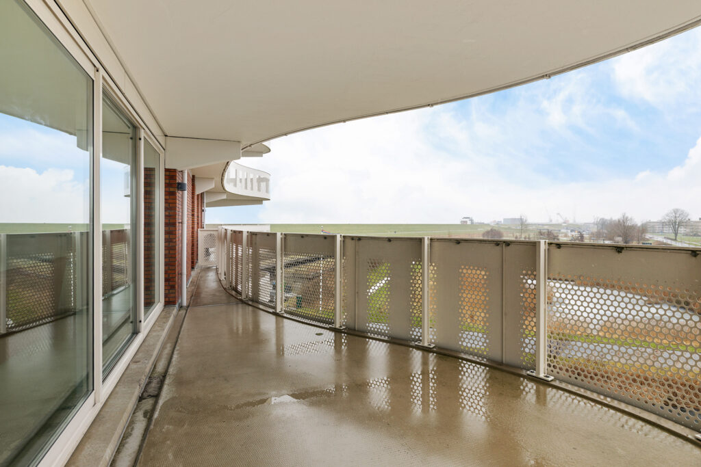 Entree/hal met meterkast, toilet en aangrenzend bijkeuken (ca. 3,5 m²; met witgoedaansluitingen en cv-opstelling), slaapkamer (ca. 16 m²), slaapkamer (10,5 m²; met kastenwand) en slaapkamer (ca. 19 m²). Vanuit laatstgenoemde slaapkamer en hal te bereiken badkamer (ca. 7,5 m²; met douche, toilet en twee wastafels), half open keuken (ca. 8 m²; met keukenblok voorzien van 4-pits gaskookplaat, combi-magnetron, afzuigkap en koel-/vriescombinatie), woonkamer (ca. 43,5 m²; met dubbele schuifpui naar het royale balkon (ca. 40 m²).