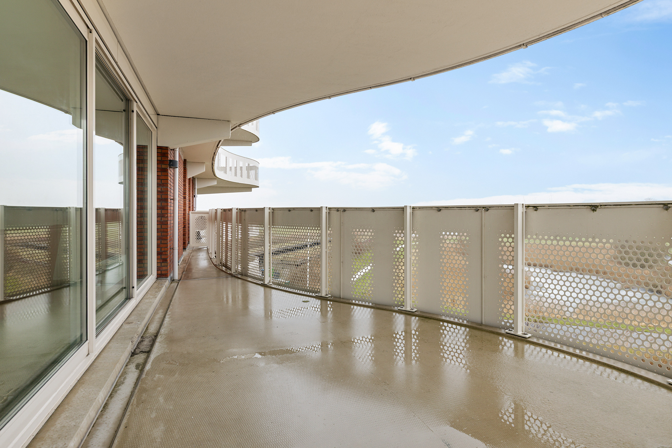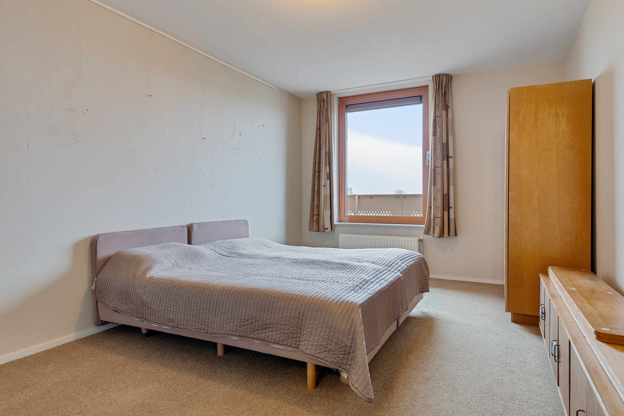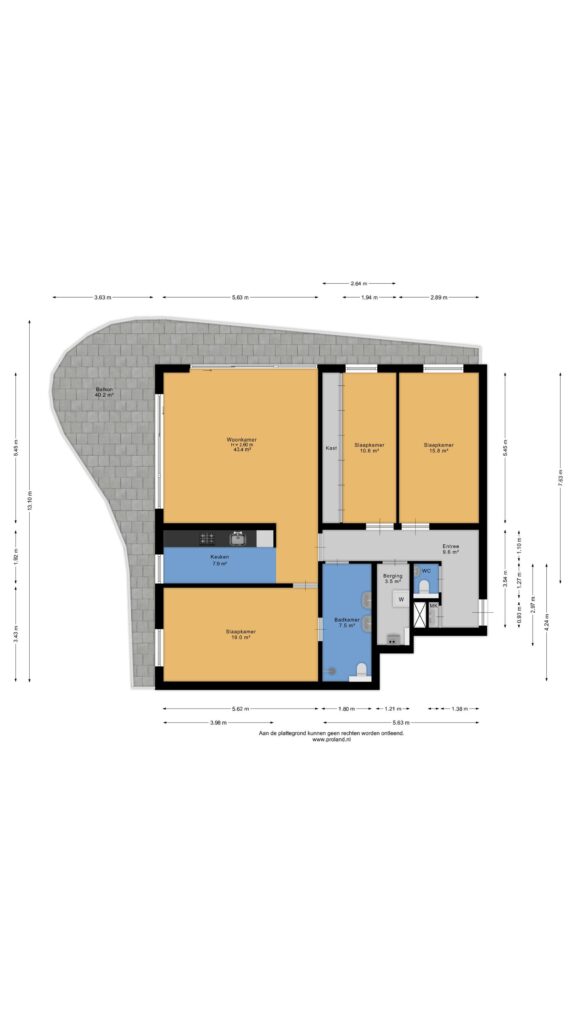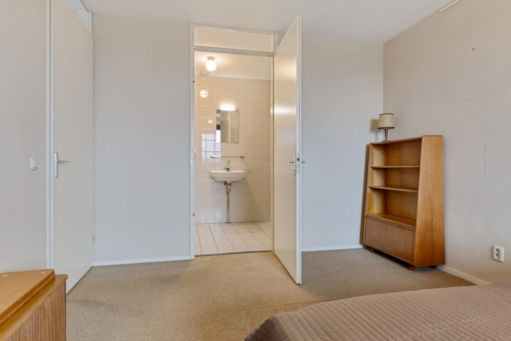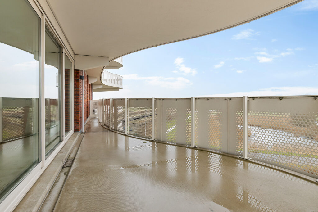 Entree/hal met meterkast, toilet en aangrenzend bijkeuken (ca. 3,5 m²; met witgoedaansluitingen en cv-opstelling), slaapkamer (ca. 16 m²), slaapkamer (10,5 m²; met kastenwand) en slaapkamer (ca. 19 m²). Vanuit laatstgenoemde slaapkamer en hal te bereiken badkamer (ca. 7,5 m²; met douche, toilet en twee wastafels), half open keuken (ca. 8 m²; met keukenblok voorzien van 4-pits gaskookplaat, combi-magnetron, afzuigkap en koel-/vriescombinatie), woonkamer (ca. 43,5 m²; met dubbele schuifpui naar het royale balkon (ca. 40 m²).
