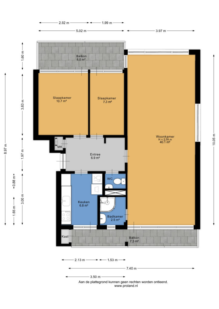 Middels afgesloten portiek te bereiken entree/hal met meterkast, keuken (ca. 7 m²; keukenblok voorzien van koelkast, inductiekookplaat, afzuigkap, vernieuwd aanrechtblad en witgoedaansluiting) en met toegang naar het balkon aan de achterzijde, toilet, woonkamer (ca. 40 m²), slaapkamer (ca. 7,5 m²; met toegang naar het balkon aan de voorzijde) en slaapkamer (ca. 11 m²; eveneens met toegang naar het balkon aan de voorzijde).