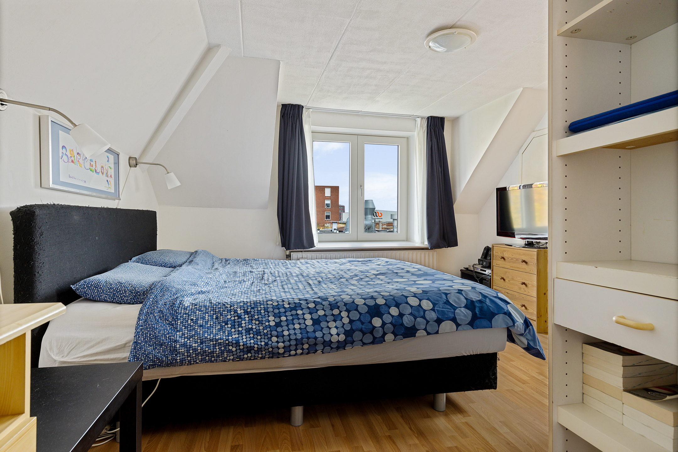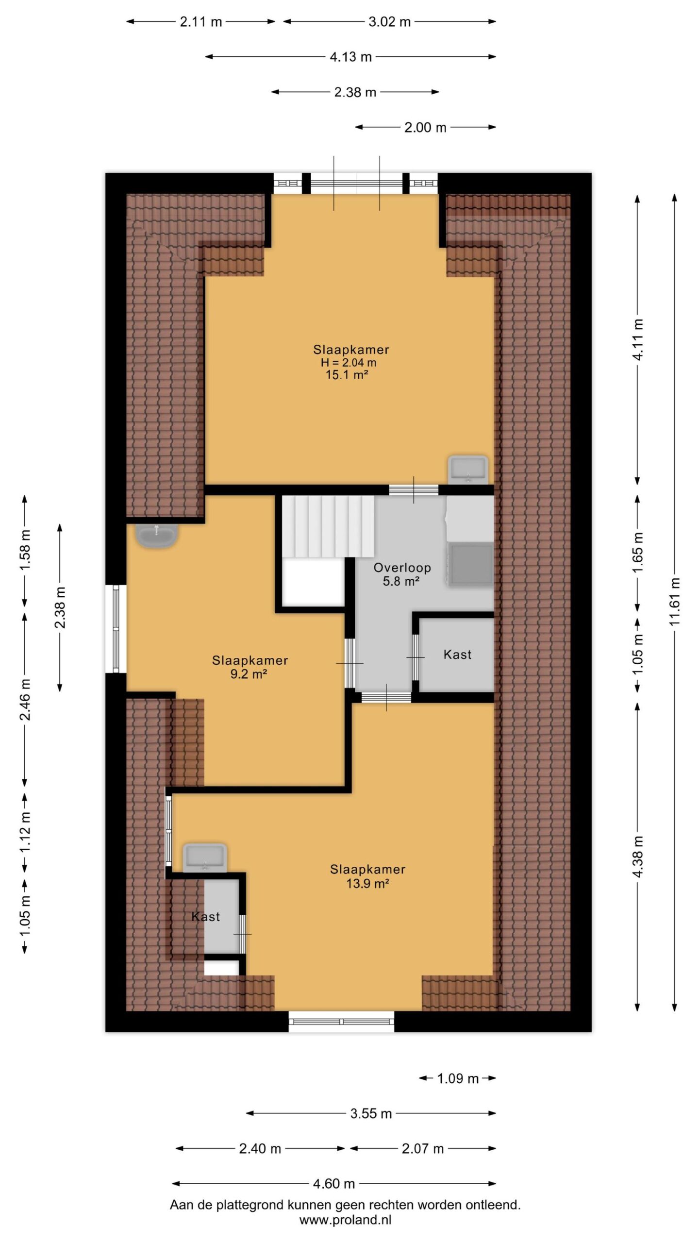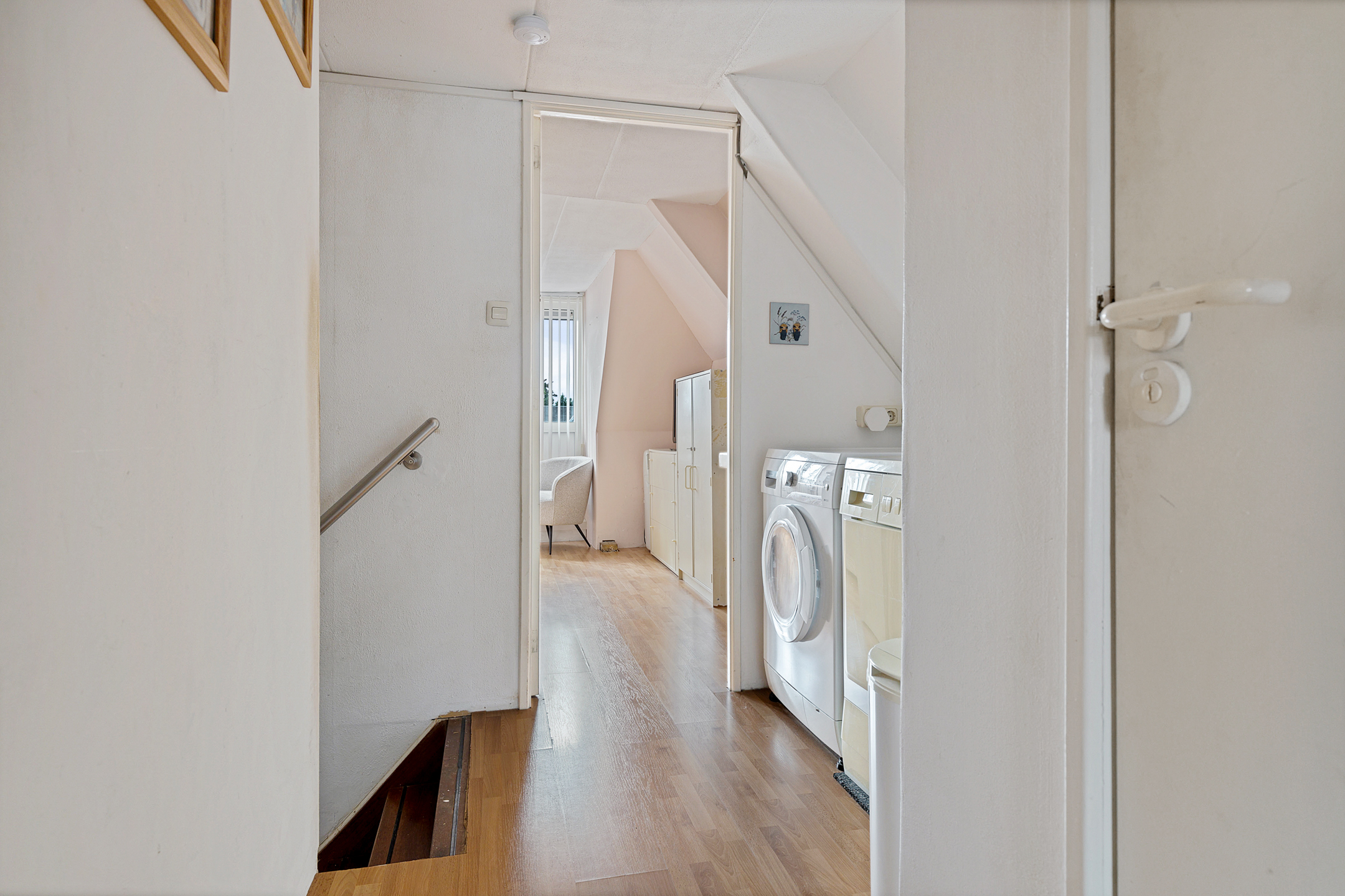 Middels vaste trap te bereiken overloop met witgoedaansluitingen, kastruimte en aangrenzend slaapkamer (ca. 15 m²), slaapkamer (ca. 9 m²) en slaapkamer (ca. 14 m²).