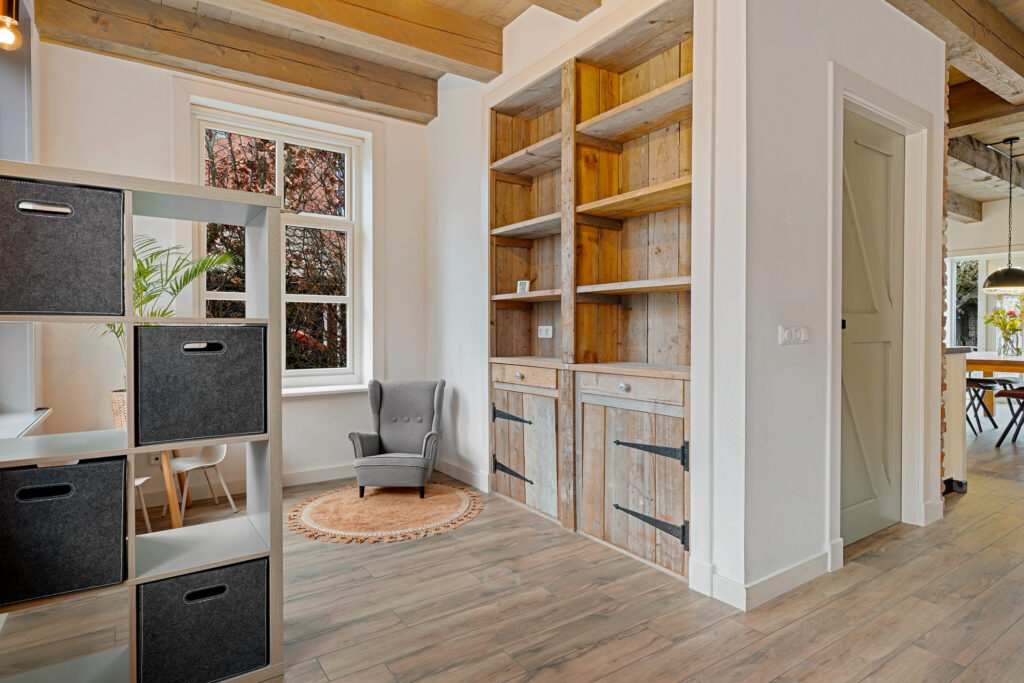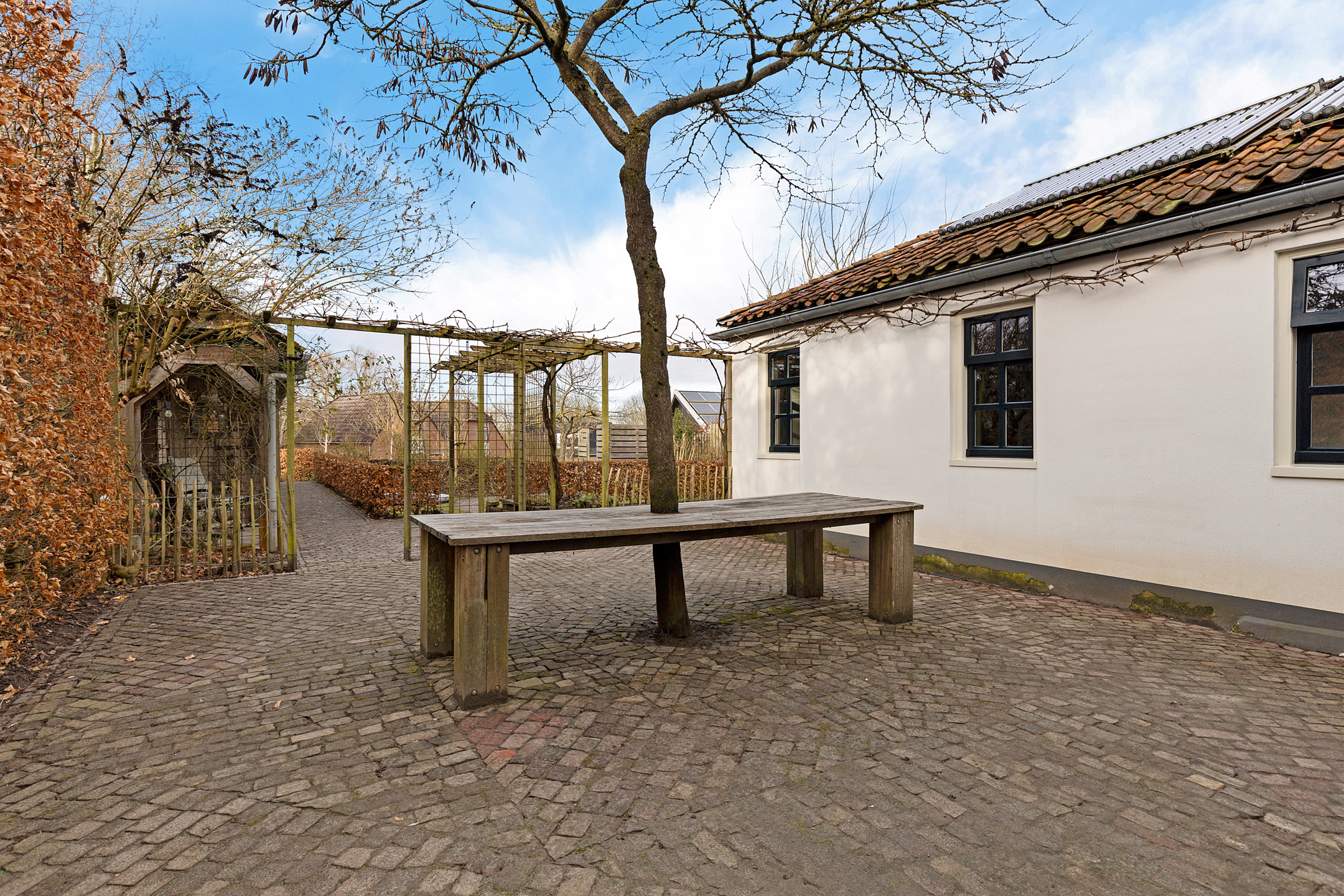 Zij-entree/hal met met meterkast, woonkamer (ca. 35 m²; met houtkachel, vaste kastruimtes en opgang naar de verdieping), woonkeuken (ca. 26,5 m²; met tuindeuren en landelijke hoekopstelling voorzien van koelkast, vriezer, vaatwasser, fornuis met meerdere ovens + 5-pits gaskookplaat en schouw), achterhal met aangrenzend bijkeuken (ca. 4,5 m²; met witgoedaansluitingen en cv-opstelling), kantoor/hobbykamer (ca. 7,5 m²), toilet, badkamer (ca. 10,5 m²; met douche, ligbad en dubbele wastafelmeubel) en slaapkamer (ca. 20,5 m²; met tuindeuren en vaste kastruimte).