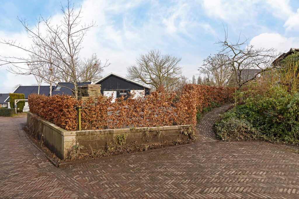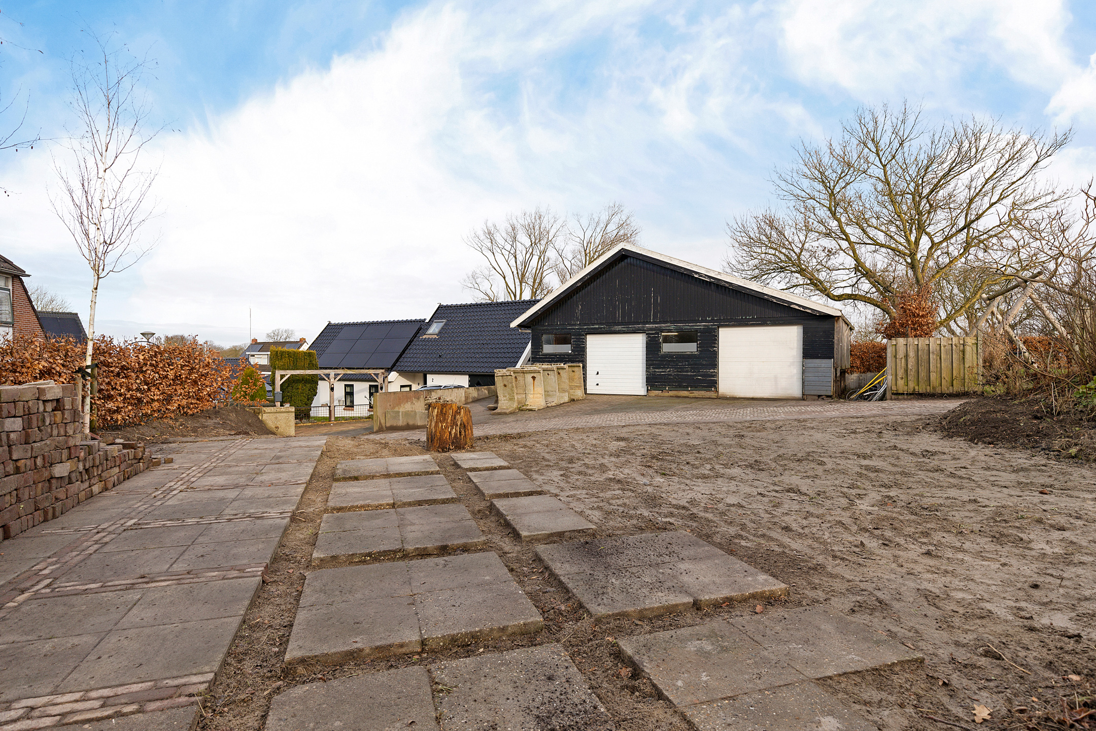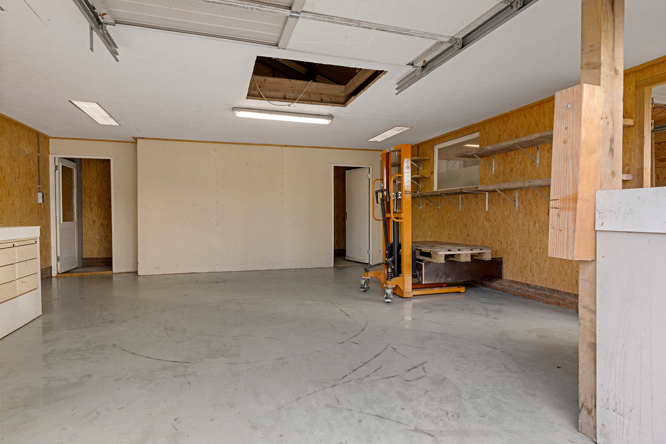 - Vrijstaande houten dubbele garage (ca. 107 m²; met gemetselde borstwering, gecoate betonvloer, bergzolder en twee sectionaaldeuren, waarvan 1 elektrisch).