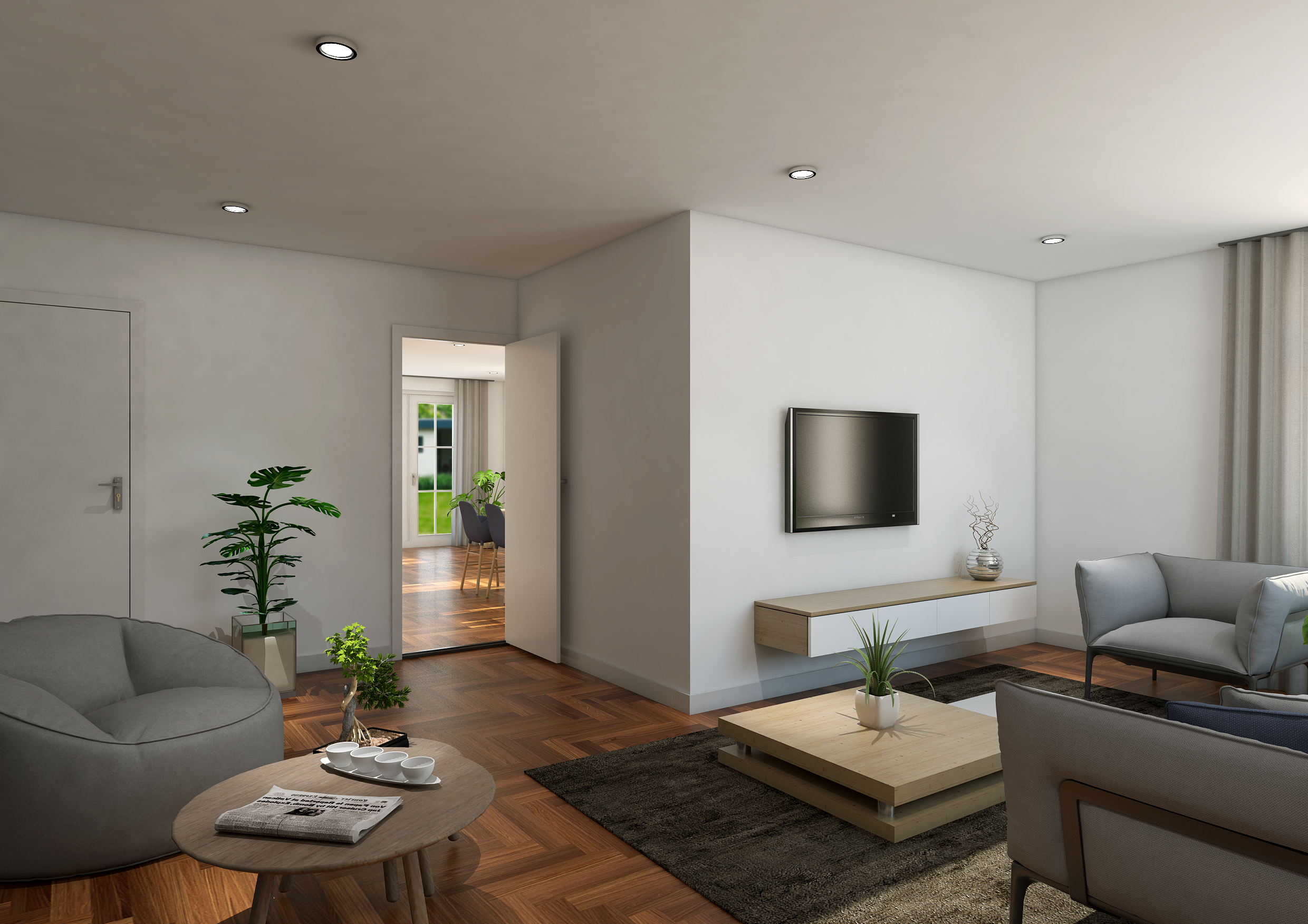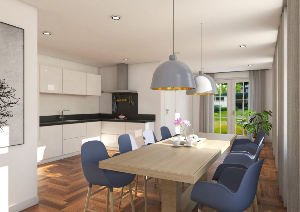 Ook van de achterzijde hebben we een impressie gemaakt. Gecombineerd met de potentie van de diepe tuin achter de woning hebben we hier het contact met de tuin proberen te vergroten. Hiervoor hebben we in de eerste plaats de woonkamer samengevoegd met de huidige keuken en in de achtergevel tuindeuren een set gevisualiseerd. De royale woonkeuken die hierdoor ontstaat biedt ruimte voor een royale keukeninrichting en dito eettafel. Voor de verdieping hebben we geen impressies laten maken maar op basis van de plattegronden blijkt dat bij herindeling de realisatie van vier slaapkamers mogelijk is.