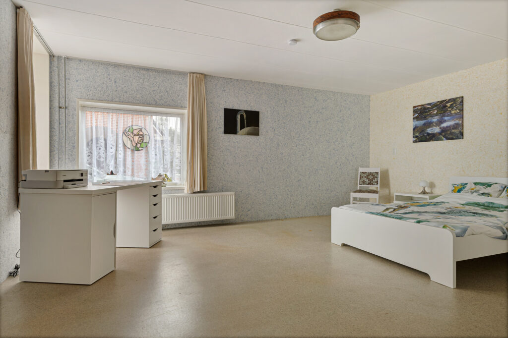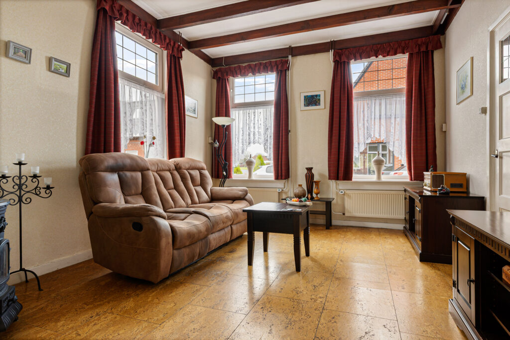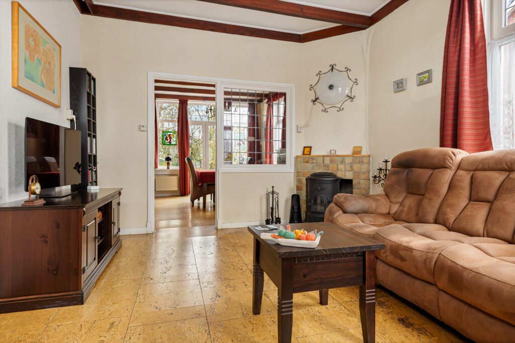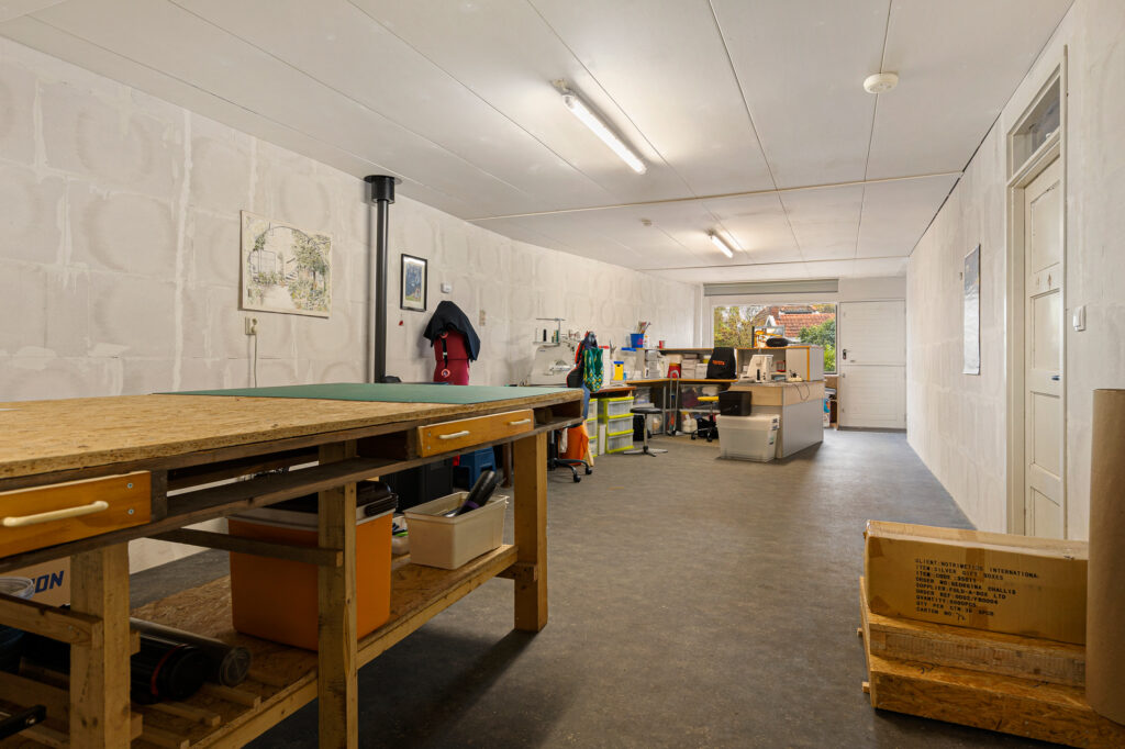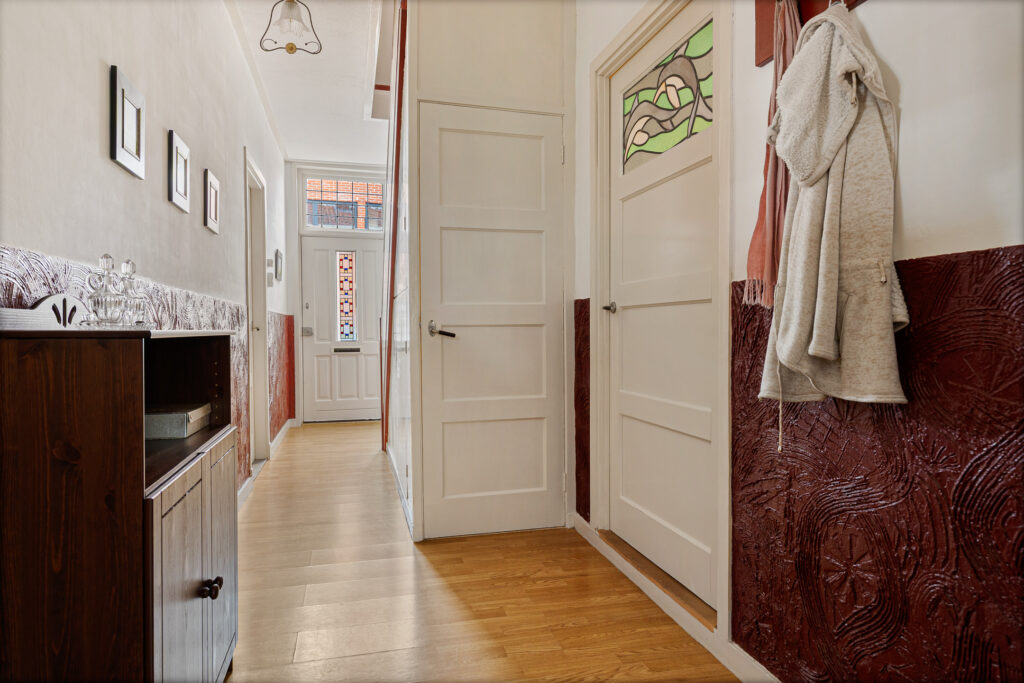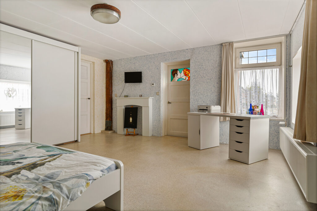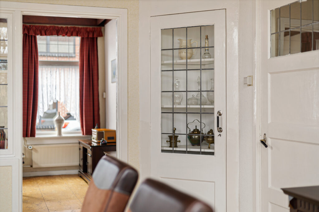 De indeling van de Houwerdastraat 18 is in de eerste plaats royaal te noemen, maar ook levensloopbestendig. Er is namelijk sprake van een ruime slaap- en dito badkamer op de begane grond. De woonkamer is middels een ‘Engelse suite’ verdeeld in een ‘eet’- en ‘zit’kamer, grenzend aan de functionele woonkeuken. Een achterhal met toilet, stookruimte en bijkeuken completeren de begane grond met de schuur en het atelier. Op de verdieping zijn de slaapkamers gesitueerd. Drie in totaal en allen van bovengemiddelde oppervlaktes waarbij twee beschikken over vaste kastruimtes.